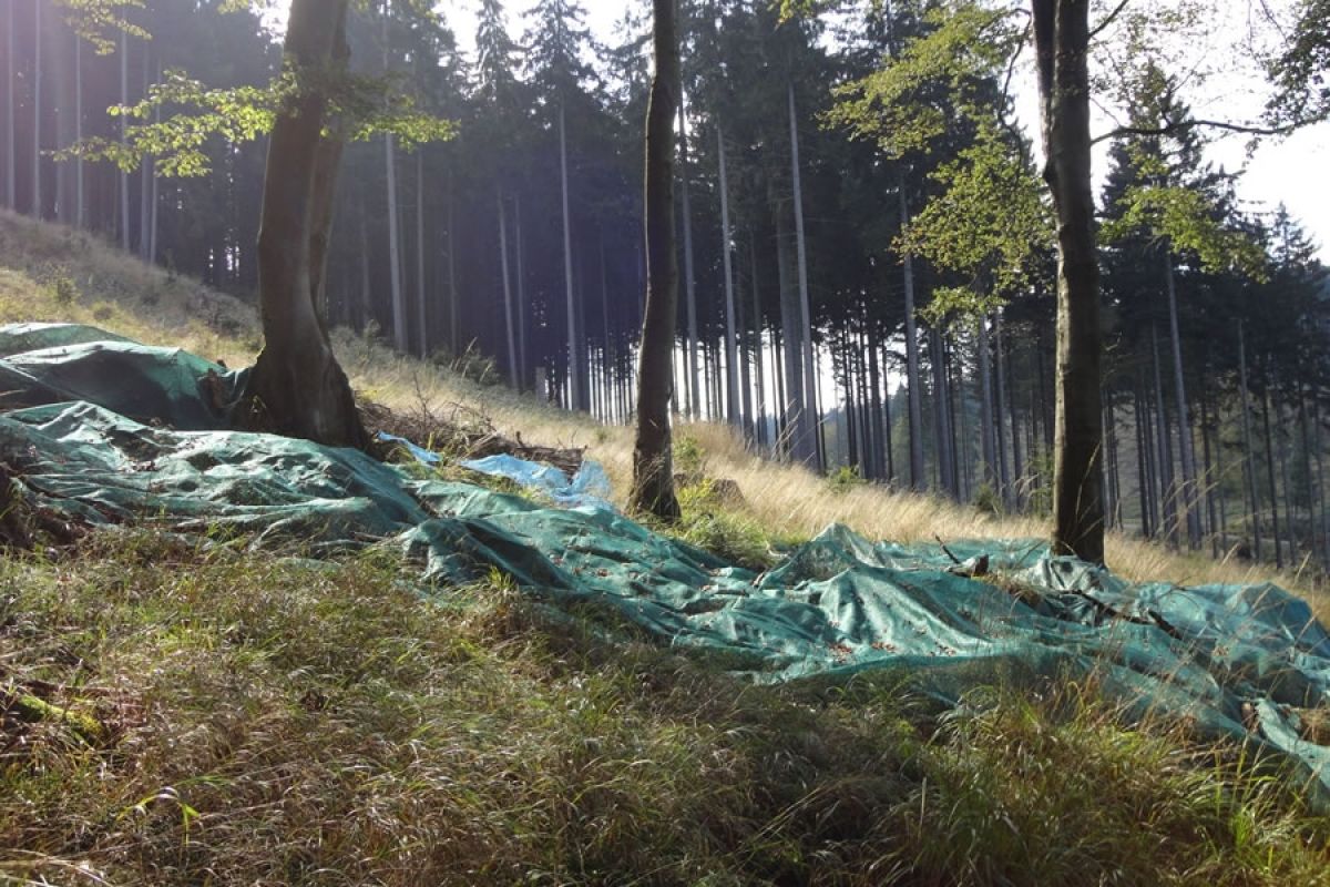 Leider gibt es in vielen Fichtenforsten im Bereich des Nationalparks Harz keine Altbuchen als Samenbäume. Deshalb werden auch in diesem Jahr Bucheckern im Nationalpark-Revier Scharfenstein in der Nähe von Ilsenburg geerntet. Dazu wurden unter den Buchen, die besonders viele Bucheckern tragen, Netze ausgelegt, um die herunterfallenden Früchte aufzufangen.